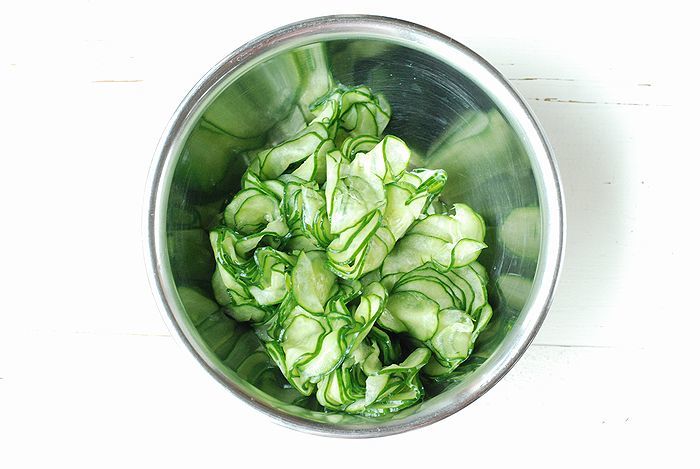 ① きゅうりはスライサーで薄切りにして塩を揉みこみます。