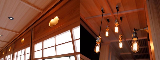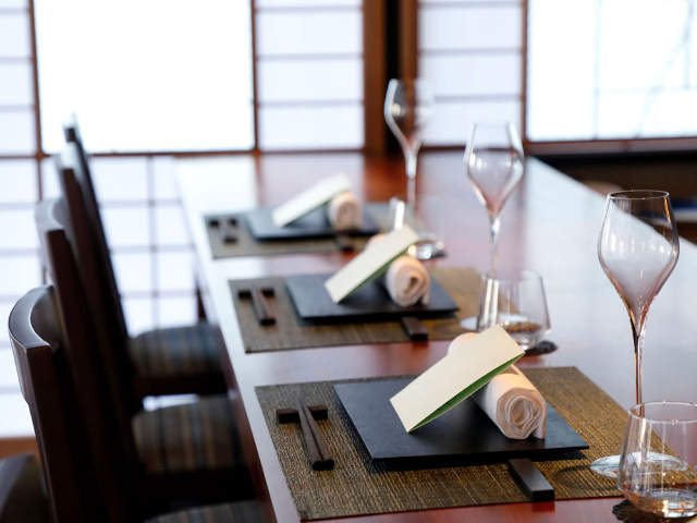 また、天井や欄間の和のテイスト、異国風のグロックライト。使う器もクラシカルなフレンチ用のものから和皿をミックスさせており、カトラリーもフォーク類と箸が並んだり、和洋折衷の雰囲気がなんとも言えず楽しい。