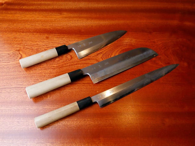 峯村さんの料理へのこだわりは、まず「和包丁」から始まる。薄刃、柳刃、出刃……、まるで日本料理店で使われているような立派な和包丁がずらりと並んでいる。