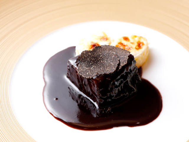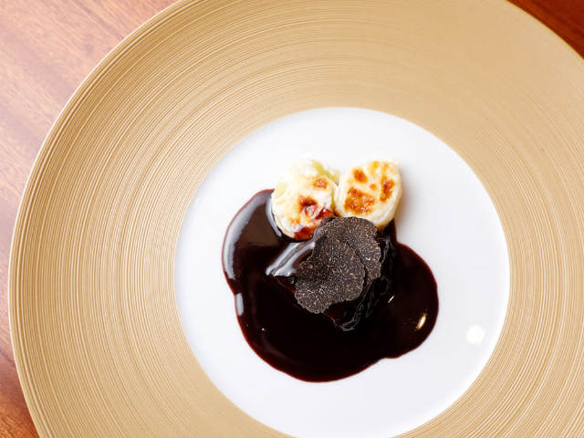 こちらは「見蘭牛の赤ワイン煮込み」(写真上)。澄んだ深紅の美しさに、スプーンを入れるのをためらってしまうほど。和牛のルーツと言われる血筋を持つ「見蘭牛」を、生の仔牛の骨でとっただしで沸き立たないように85℃程度の温度でゆっくりと煮込む。スプーンがスッと入るほど煮込まれながら、噛みしめると牛肉らしい身の味わいを感じ、それをまとめてくれる澄んだ味わいの赤ワインソースとアクセントに加わったトリュフの香りが絶品!