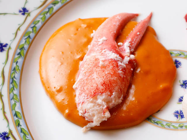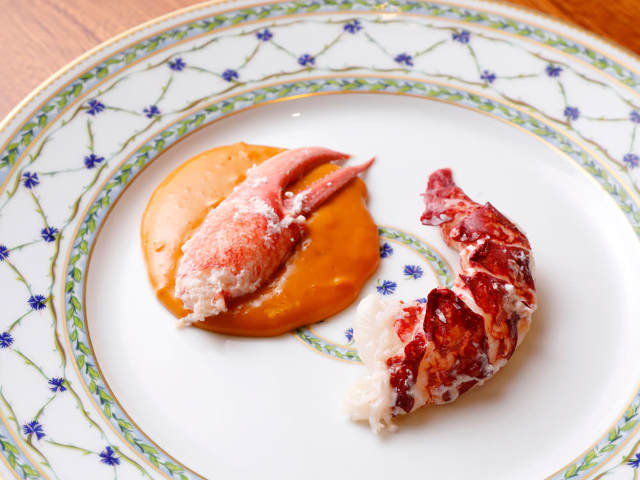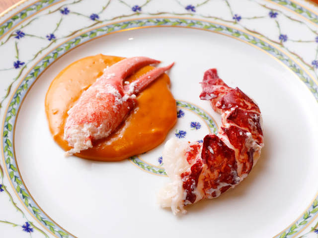 下ごしらえの過程もこだわりがあり、この品を作るときは必ず活けで仕入れたオマールブルーを使い、オマールブルーの性質に合わせて、「コントレックス」、つまり硬水を使い、生きたまま茹でるそうだ。