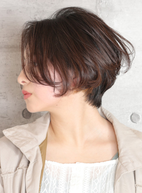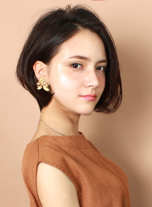 横からのシルエットが格別に綺麗なショートボブ。思わずどきっとするような色っぽさが魅力的。毛先にワンカールパーマをかければ、ヘアバームを揉み込むだけで美シルエットに仕上がります。