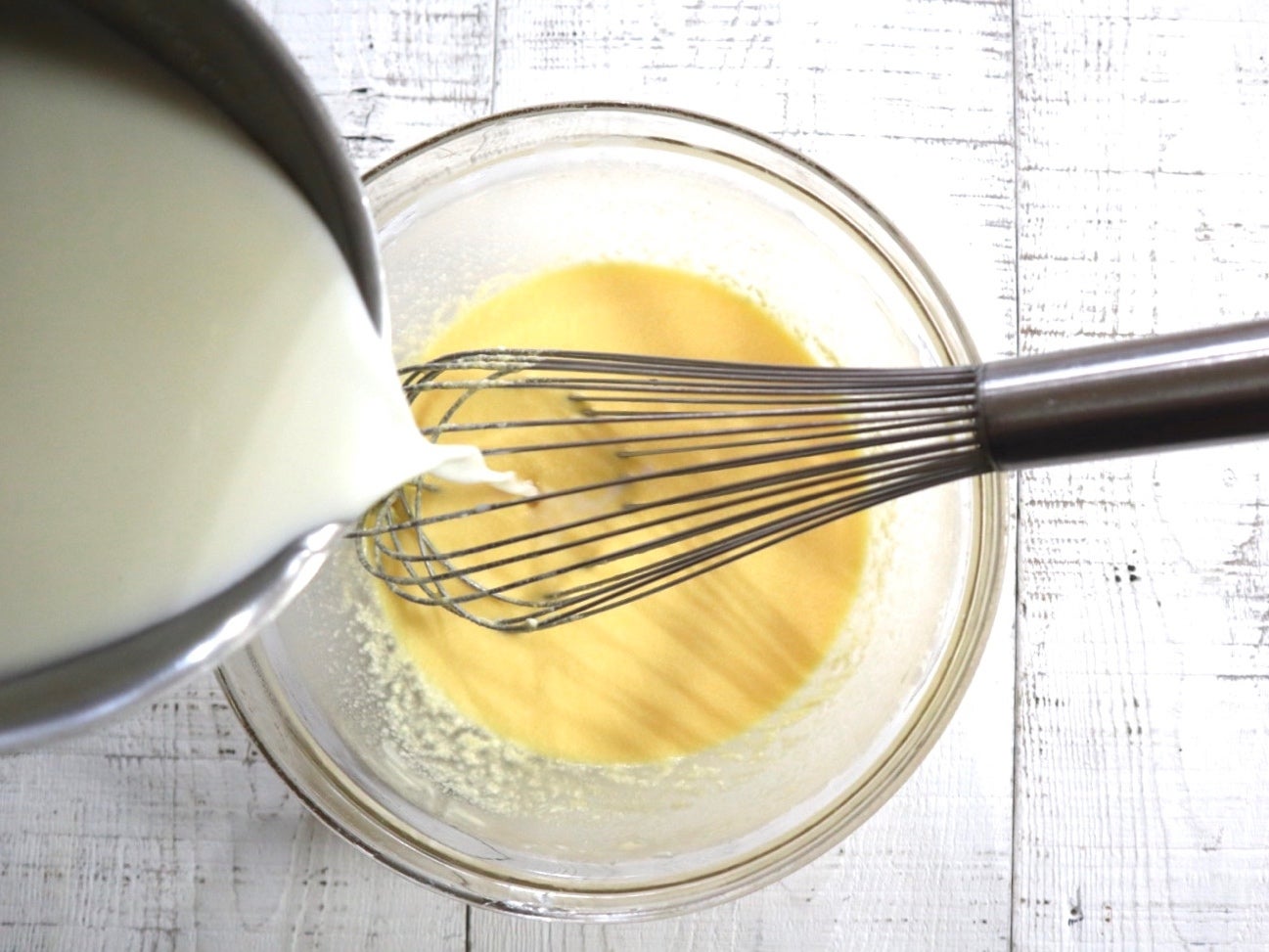 ③ 鍋に◎を入れて加熱し、グラニュー糖が溶けたら火からおろし、バニラオイルを加え(沸騰させないように注意)、②に加えて混ぜ合わせます。