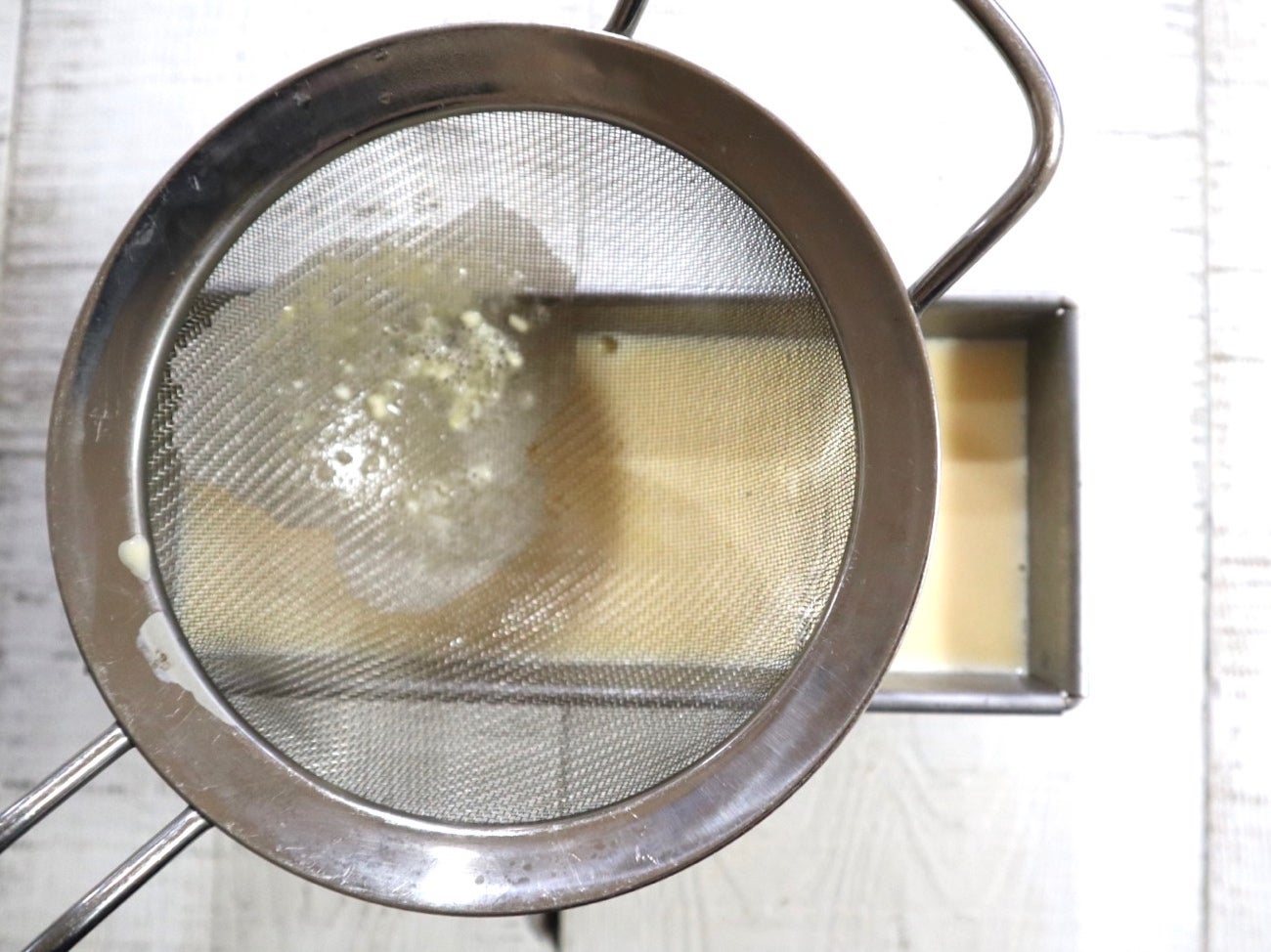 ④ ①に③を漉しながら流し入れ、天板にのせて約60°のお湯を1cmほど張り、150℃に予熱したオーブンで25〜30分蒸し焼きにします。焼き上がったらオーブンから取り出し、冷めたらラップをして、冷蔵庫で4〜5時間以上冷やします。