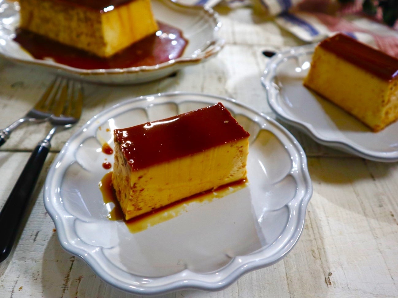 ① グラニュー糖・水を鍋に入れて火にかけ、茶色く色付いたら火から下ろして、熱湯を加え、熱いうちに型に流し入れ、冷蔵庫で冷やしておきます。
