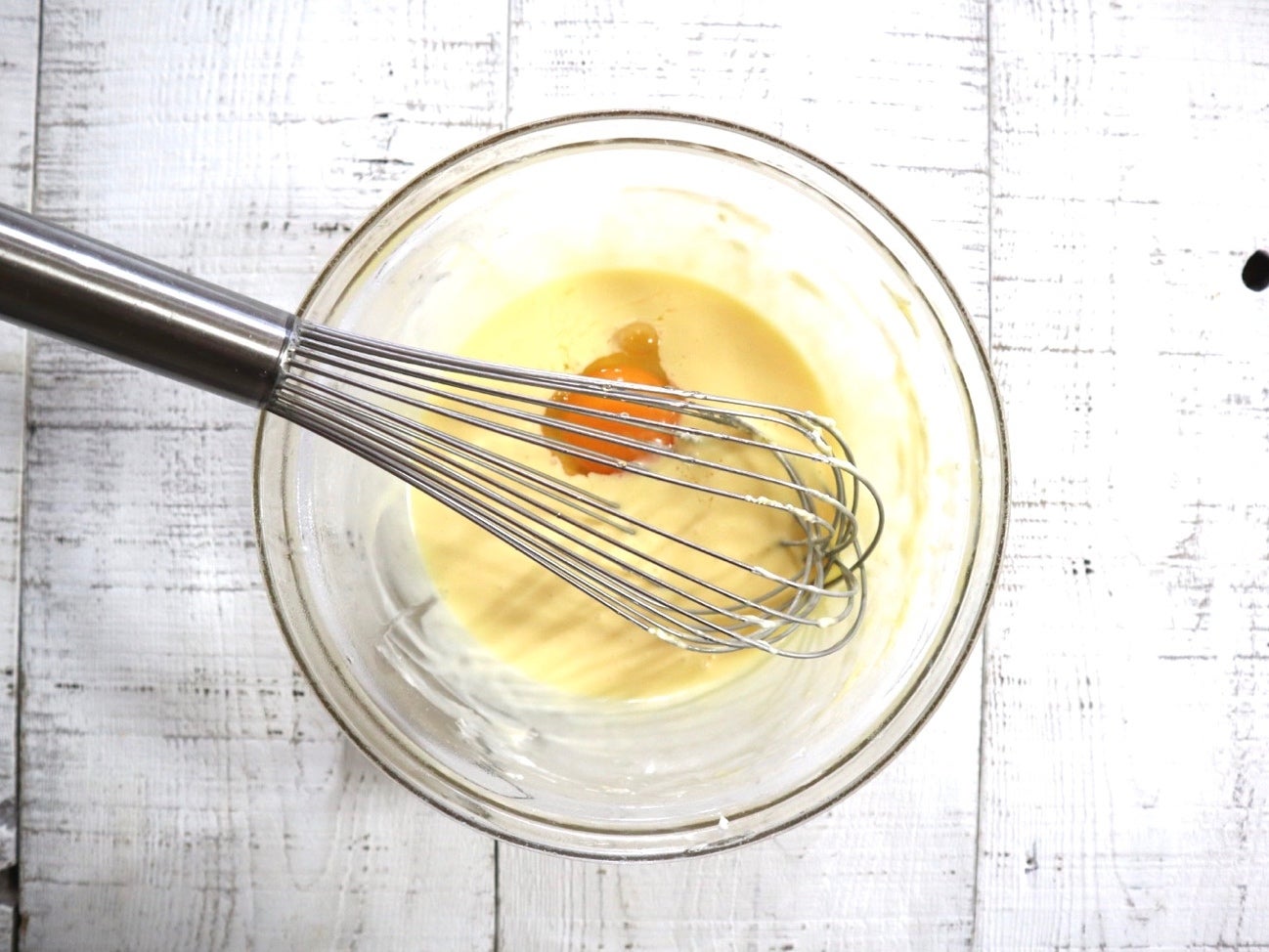 ② クリームチーズをボウルに入れて、ホイッパーで滑らかに攪拌し、卵を1個ずつ加え、その都度よくまぜ合わせます。コーンスターチを加えてさらによく混ぜます。