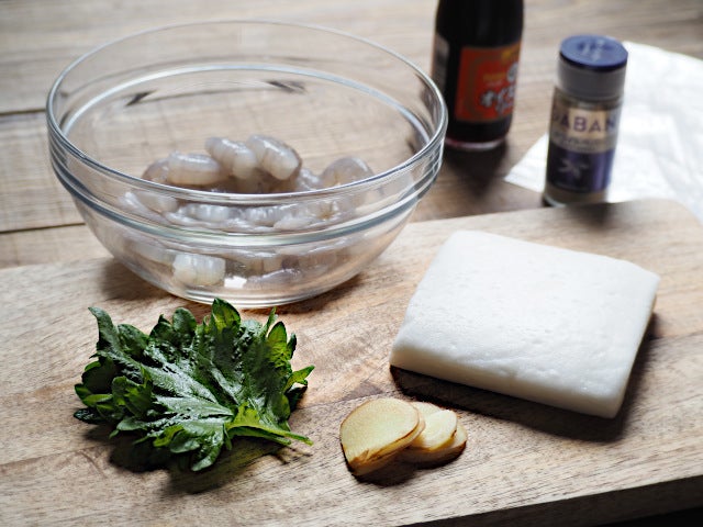 ① 剥き海老は、流水で洗い、キッチンペーパーで水気を拭いたら、7~8mmほどの大きさに切る。または、粗めに包丁で叩く。
