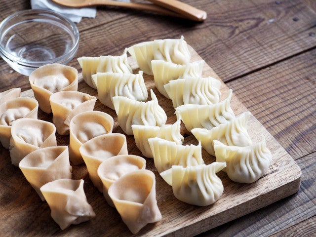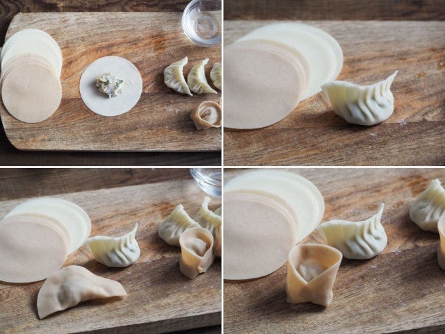 タネを乗せる量は、ティースプーン1杯くらいです。他にも、皮の中央にタネを乗せ、半分に折って端と端をつまんで押さえると、丸い形に包めます。皮の重なる部分は、水を付けて留めて下さい。