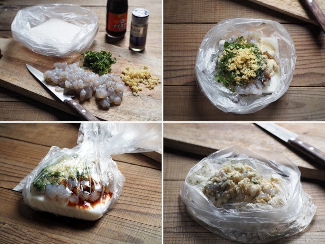 ⑤ ビニール袋の口を片手で押さえ、はんぺんが海老と同じくらいの大きさになるよう、ビニール袋の上から潰すようにしながら混ぜて、タネを作る。