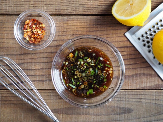 ⑨ 4等分にしたレモンの輪切りを添え、小口切りにしたあさつき、レモンの皮、粗挽き唐辛子を散らす。