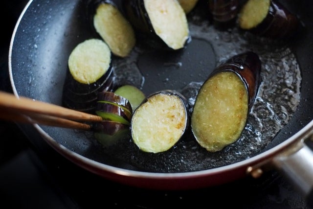 2をフライパンに入れ、ナスに油をからめながら多めに入れ、中火で揚げるように焼きます。