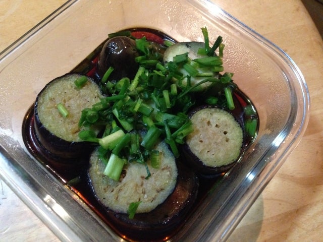 ナスが冷めてきたら、合わせ調味料ごと保存容器に入れ、3の小ねぎをかけて完成です。