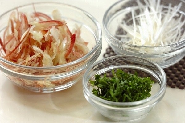 1、大葉は軸を切り落とし、縦半分に切ってせん切りにする。ミョウガは縦半分に切り、縦に薄切りにする。白ネギは白髪ネギにする。ミョウガ、白ネギは水に5分ほどさらし、水けを絞る。