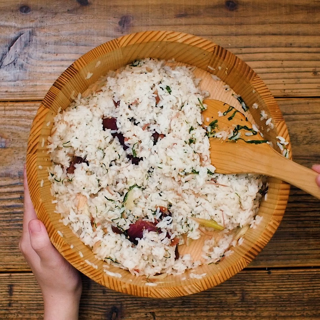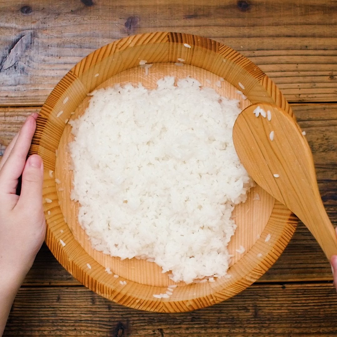 飯台にあたたかいご飯を入れて、寿司酢を回しかけます。うちわであおぎながら切るようによく混ぜます。