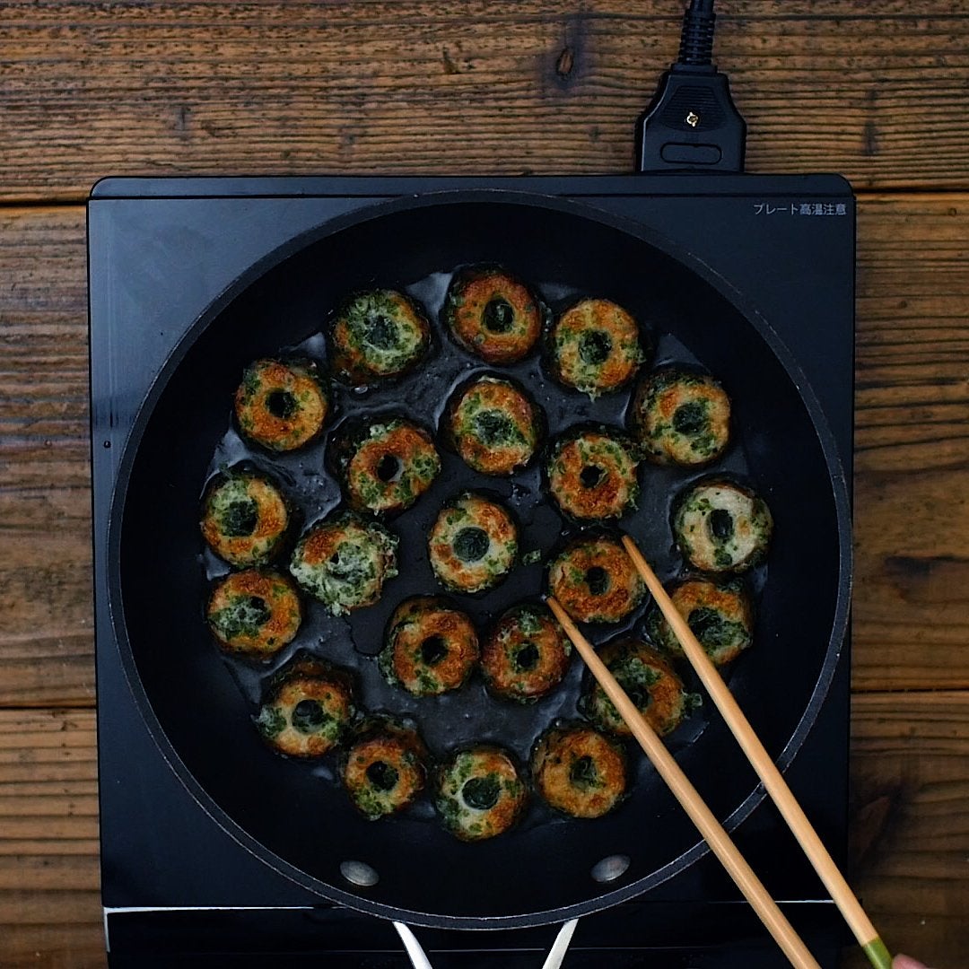フライパンにサラダ油を引き中火で熱し、ちくわを並べ入れます。両面こんがり焼き色がついたら取り出します。