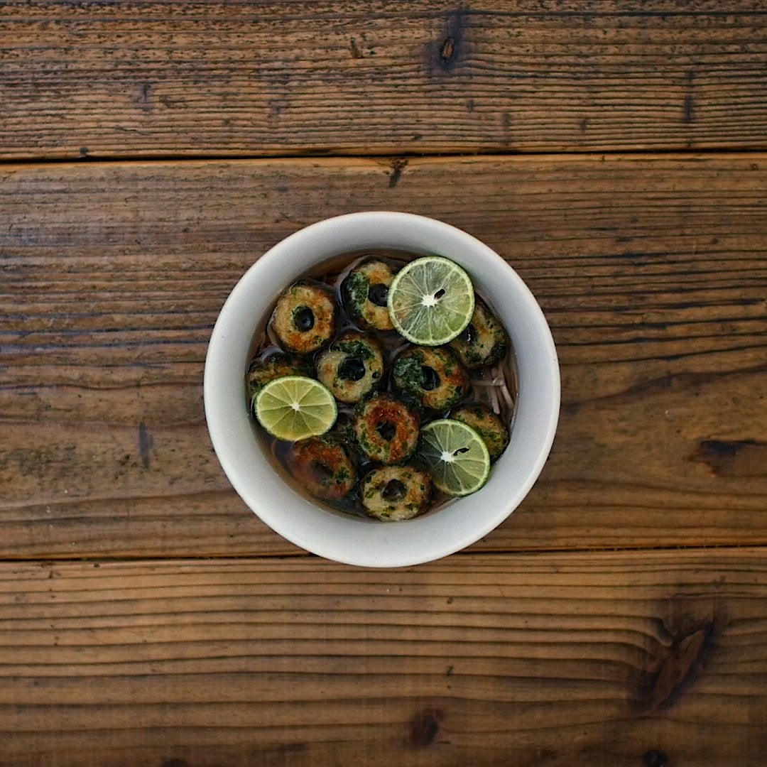 粗熱が取れたら冷水を加えて混ぜ合わせます。器にゆでたそばを盛り付けてつゆをかけます。ちくわ、すだち、刻み海苔をトッピングして完成です。