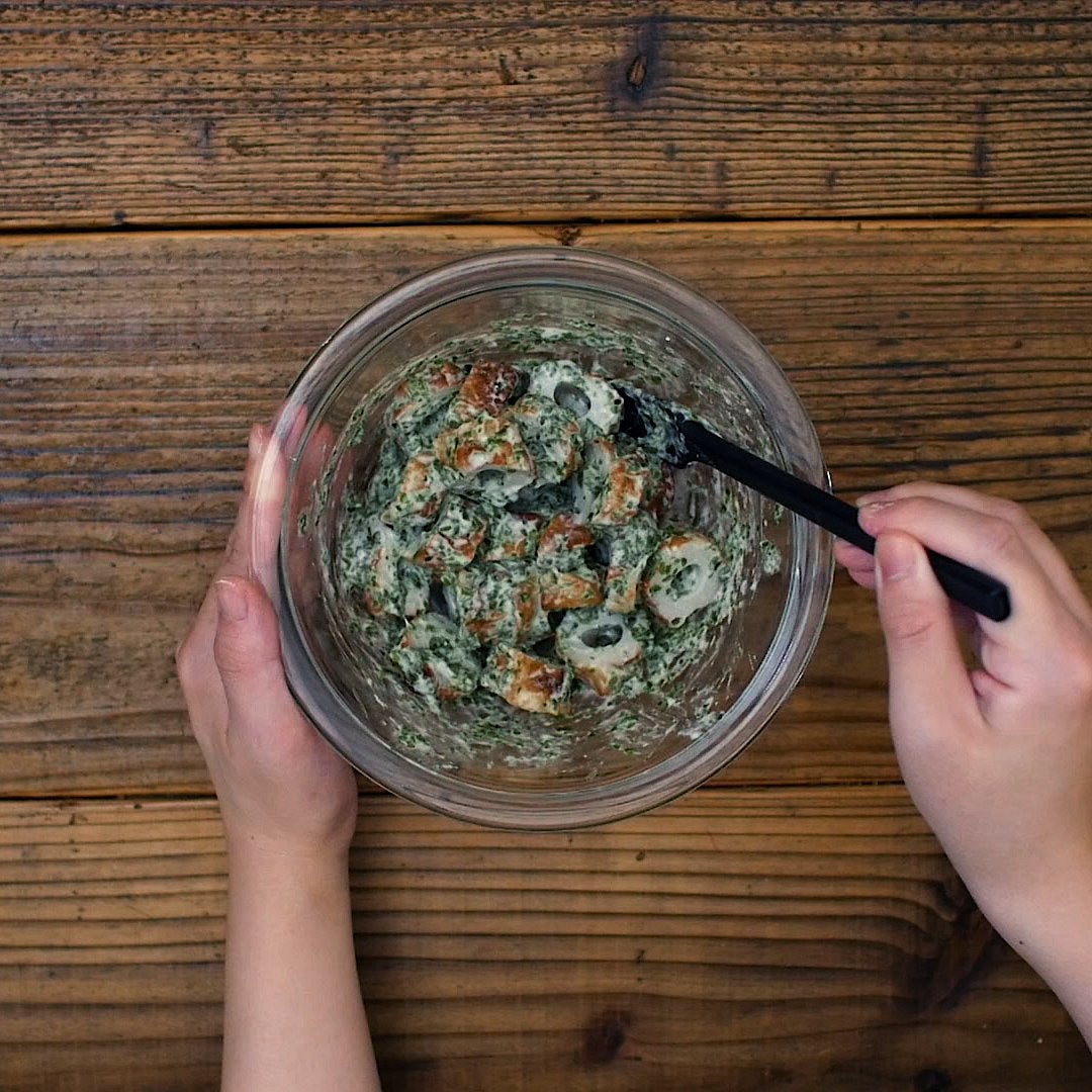 ボウルに (a) の材料を入れて混ぜ合わせ、ちくわを加えて衣を絡ませます。