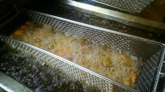 170℃~180℃に熱した油で、じっくりと揚げていく(しょうゆ多めの衣なので、あまり高い温度で揚げると衣が先に焦げてしまうため注意してください!)