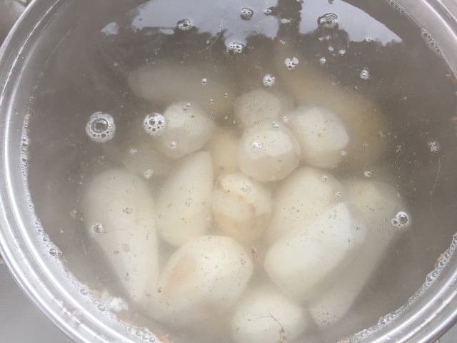 茹であがったらすぐ冷水にとって冷やします。すると指だけでするすると簡単に皮をむくことができます。