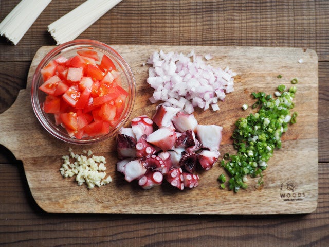 ① トマトは1cmほどの角切りに、蛸は小さ目のぶつ切りにする。