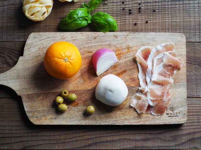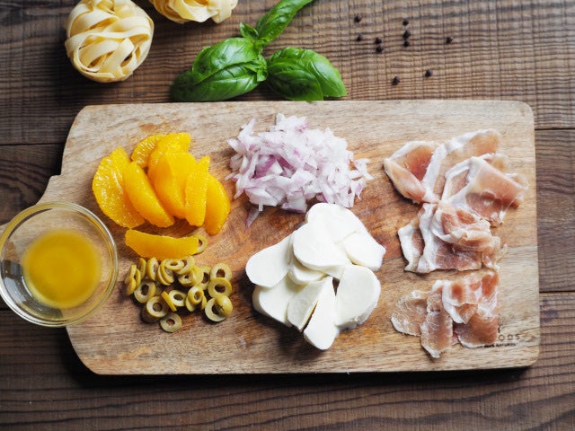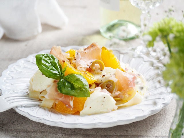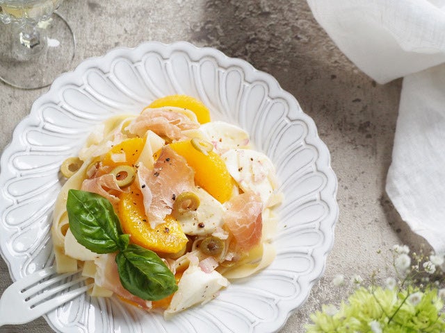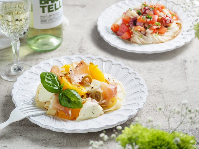 生ハムとグリーンオリーブの塩気が、甘酸っぱいオレンジと合う爽やかな冷製パスタです。