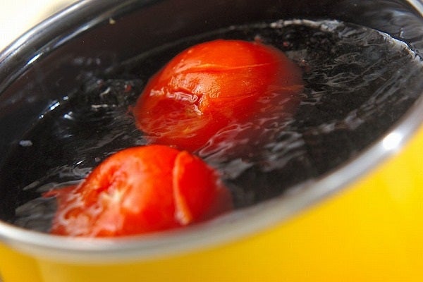 ・トマトはヘタをくり抜き、サッと熱湯につける。冷水に取って皮をむいて水気を拭き取り、切り離さない程度の深さまで十字に切り込みを入れる。