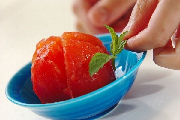 2、器にトマトをのせ、保存容器に残った白ワインをかけ、ミントの葉を添える。