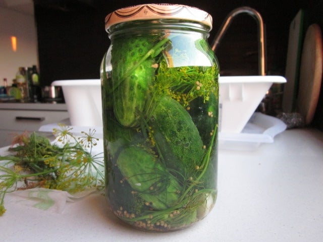 瓶を使用前にきちんと煮沸消毒し、できあがりを湯煎で煮沸したピクルス、実は4ヶ月以上は冷蔵庫でもつのですが、それは開封していないことが前提なんです。開封してしまえば冷蔵庫で1ヶ月です。ですからピクルスは冷蔵庫で1ヶ月保存だと思っていただくと安心です。