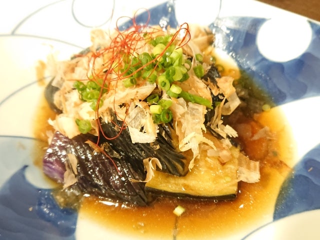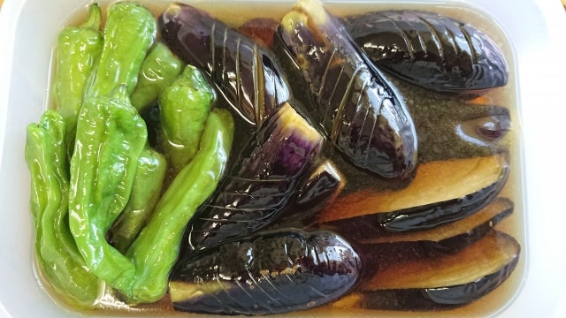冷凍した揚げなすに麺つゆをひたして冷蔵解凍したらそれだけで揚げびたしが作れちゃいます。