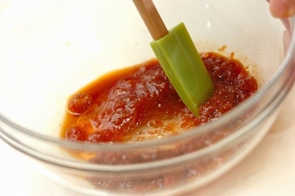 ・<梅ダレ>の梅干しは種を取り、ペースト状にたたいて他の材料と混ぜ合わせる。