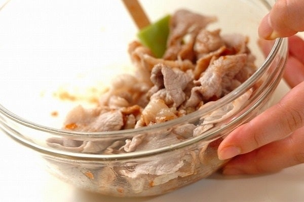 1、熱湯に酒を入れて火を止め、豚肉を入れてほぐす。再び火にかけ、煮たったら豚肉を冷水に放ち、水気を絞って<梅ダレ>で和える。