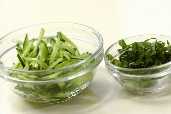 ・キュウリは斜め薄切りにし、さらに細切りにする。大葉は軸を切り落として細切りにする。