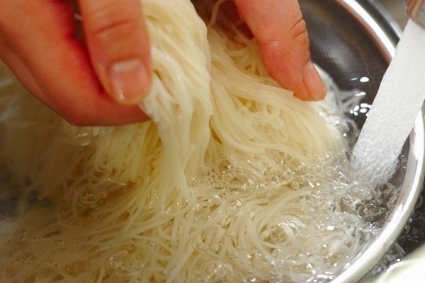 2、素麺は指定時間通りにゆでてザルに上げる。冷水でもみ洗いしてぬめりを取り、水気をきって器に盛り、素麺つゆをかける。