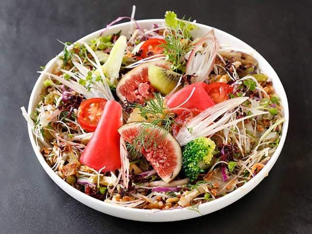 なかでも注目は、40種類以上の食材を使う「デトックスサラダ」(写真上)。ナッツやカカオニブ、大麦、フライドオニオン、クコの実、カボチャのタネ、白キクラゲなどのヘルシー食材をふんだんに盛りつけた一皿は、すべての食材が食べやすいサイズにカットされているため、スプーンですくって食べられるのがうれしい。味付けはマスタードドレッシングがベースだが、ネギまたは山椒の香りを付けたオイルを加えてくれるため、独特の香味ごと堪能できる。
