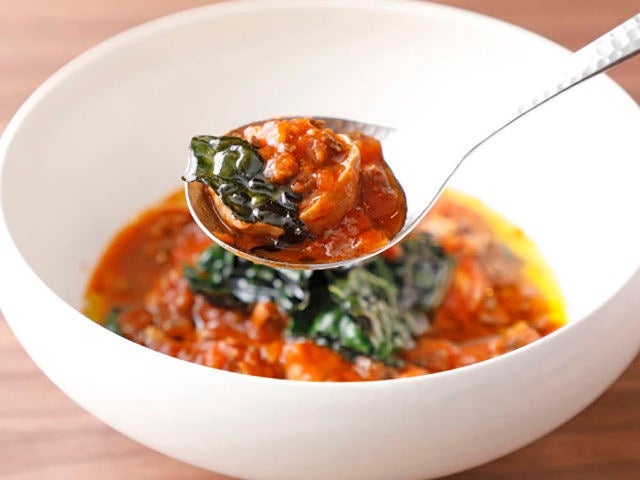そのモツを使って煮込んだ料理が、ズッパフォルテというナポリの郷土料理がベースとなっている「豚モツの辛いトマト煮込み」(写真上・左)。静岡県産のブランド豚「天城黒豚」のさまざまな内臓肉をピリッと辛いトマトソースで煮込み、独特な苦みを持つ黒キャベツをトッピングした一品だ。