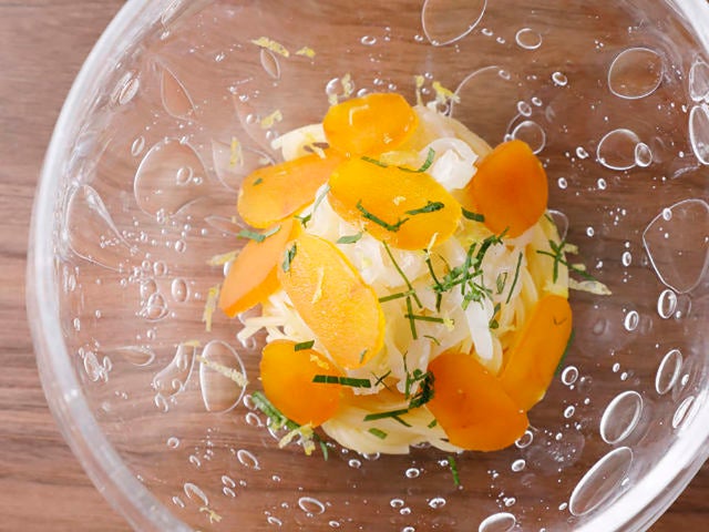 信頼を寄せる業者が目利きした鮮度抜群のボラの卵巣で作ったカラスミが主役の「自家製カラスミとアオリイカの冷製カッペリーニ」(写真上・右)もまた、同店の自慢の一品だ。長崎県五島列島の『林鮮魚店』より直送されたアオリイカとの相性が抜群だ。