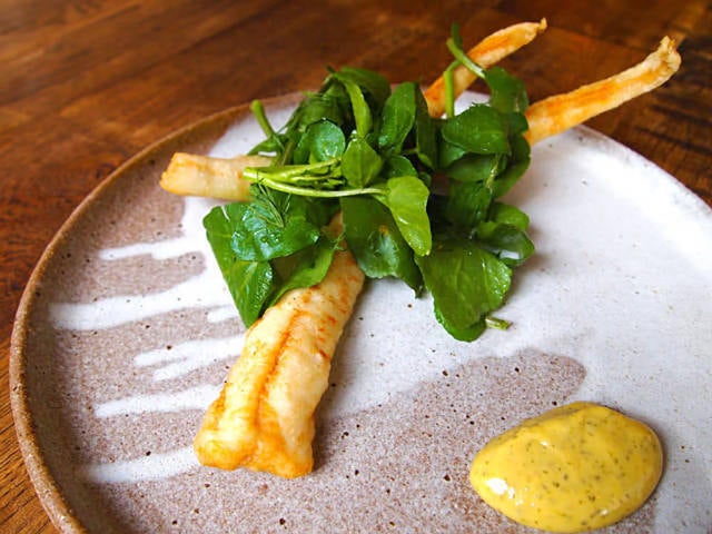 岩手県産の天然アナゴのフリット(写真上・左)は、自家製のディルマヨが添えられて登場。細かく刻んだハーブのディルにレモン汁の酸味が加わったソースは、淡泊なアナゴと相性がよく、ワインがくいくい進みそう。