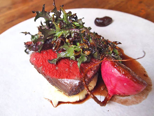 じっくりと時間をかけて火入れされた「エゾジカのモモ肉のロースト」(写真上・右)は、驚くほどやわらかく、肉汁がたっぷり。肉厚のモモ肉をやさしく支えるクリーミーなマッシュポテト、みずみずしさいっぱいのどっしりした赤カブ、軽く火を通したケールとのコラボレーションを楽しみながらゆっくりと食べ進めていくひとときには、一緒に料理を囲むみんなの顔から思わず笑みがこぼれそう。