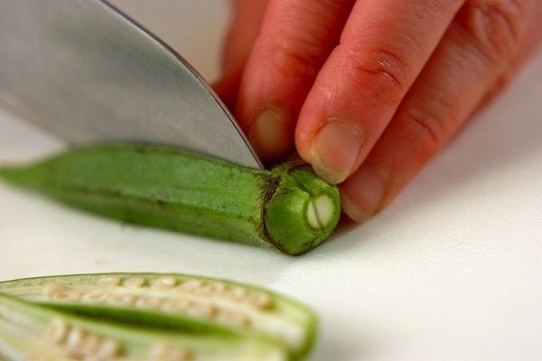 1、オクラは縦に2等分にする。タコの足は2等分にし、オクラと同じくらいの大きさに切る。ニンニクはみじん切りにする。