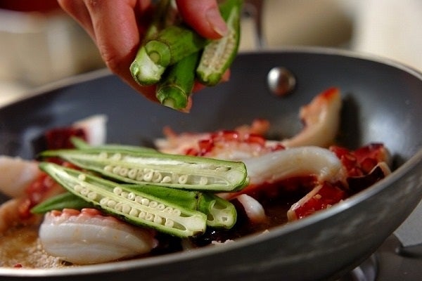 2、フライパンにゴマ油とニンニクを入れて熱し、香りが出たらタコを加えて炒める。全体に油が回ったら<調味料>の材料を加え、オクラも加えてさっと炒め合わせる。