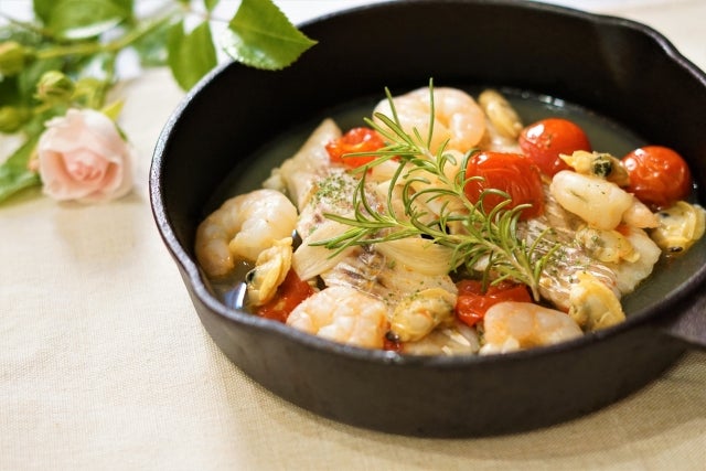 アクアパッツァは彩り豊かで、パーティにもうってつけです。その割には味付けがシンプルで、手順も少ないのがおすすめポイント。下ごしらえだけすれば、あとはオーブンに入れっぱなしで完成するのは嬉しいですよね。
