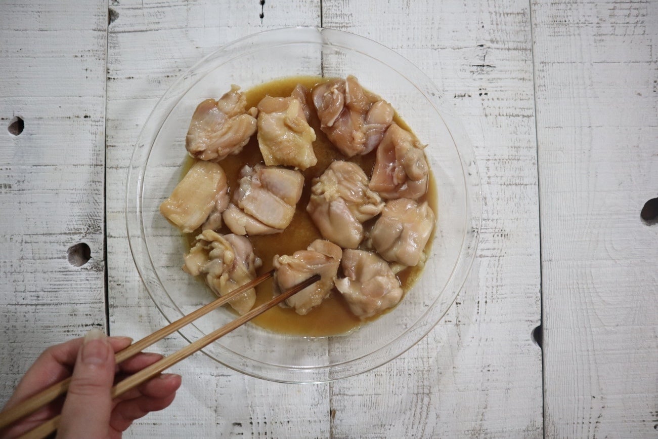 ① 平らな耐熱皿に酒・醤油・砂糖・みりんを入れて混ぜ合わせ、ひと口大にカットした鶏もも肉を漬け込んで、皮目を下にして10分程放置しておきます。