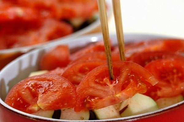 火を使わず作ることができる「ナスとトマトのグラタン風」。