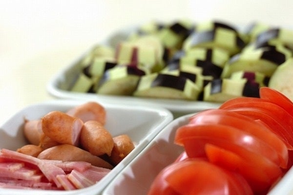 夏が旬のナス、トマト、そしてベーコンとソーセージを一緒に耐熱皿に並べて、ピザ用チーズとパン粉にバターなどを乗せたらあとはレンジでチン! で完成しちゃう簡単レシピ。