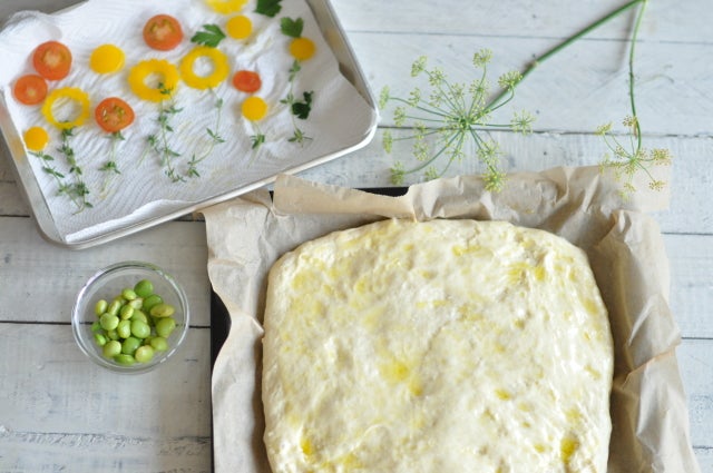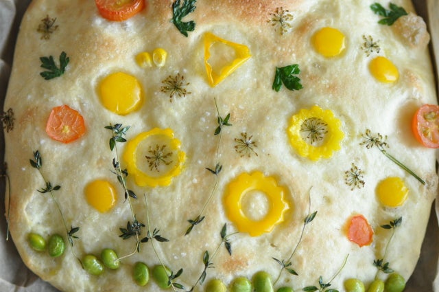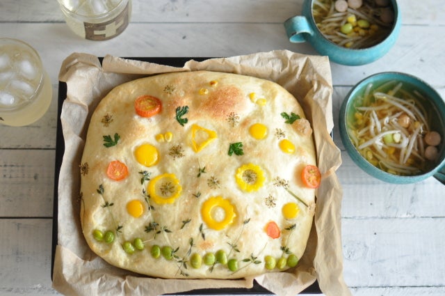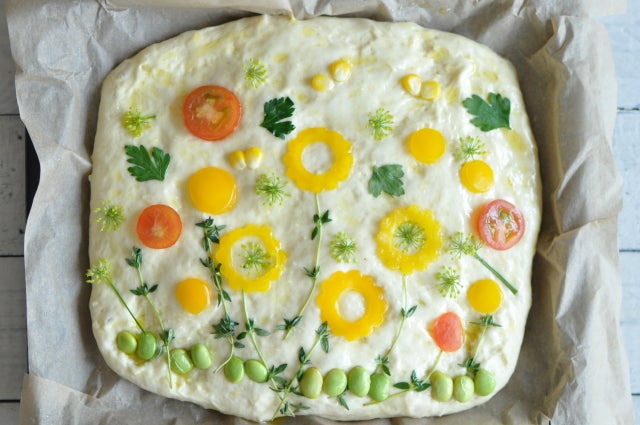 夏休みや休日にお子さんと一緒に楽しめるフラワーフォカッチャ。夏野菜やハーブでカラフルに彩ってフォカッチャをキャンバスに見立て、絵を描くつもりで楽しんでください。