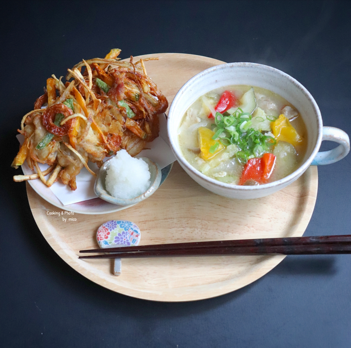 そして、おかずはかき揚げにしました。夏場の炊事がつらい料理と言えば……まず思いつくのが揚げもの。それも、いろいろな具材をたくさん揚げないといけない天ぷらではないでしょうか。そこで、全部まとめて揚げちゃえ!という気持ちで、かき揚げにしました。