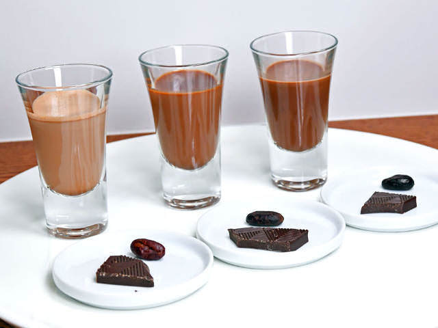 店内に併設するカフェスペースで楽しむなら、なんといっても「産地飲み比べセット」(写真上)がおすすめ。産地やカカオ含有量の違いを比較できるお得なセットで、カカオジュースとタブレット、カカオニブの3種が同時に試せる内容となっている。