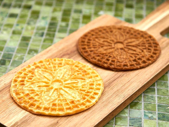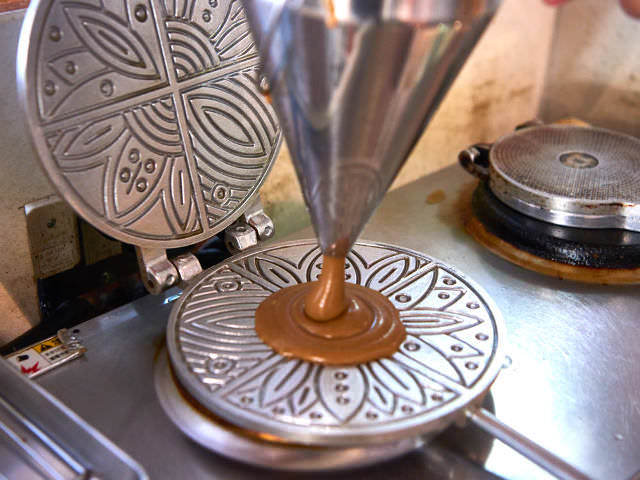 同店では、専用の鉄板焼型に、小麦粉、卵、砂糖、牛乳、バターで作った生地を流し込み、2枚の焼き型を合わせて焼き上げる。焼型に刻まれている柄は本来、新郎新婦それぞれの家の家紋で、ぴったりと合わせて焼くことで両家の結びつきが強くなると考えられていたという。
