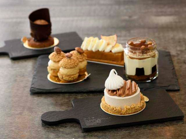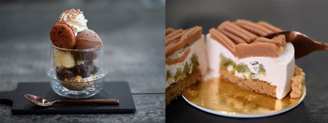 定番のパフェ「ショコラ」(写真上・左)は、自家製ショコラとバニラソルベ、サクサクのマカロンラスク、しっとり濃厚なブラウニー、カリカリ食感のグラノーラが詰まった愛らしい見た目の一品。ラム酒が香るマロンペーストとクリームの中に、爽やかなすだちのコンポートと黒糖のスポンジが顔をのぞかせる「モンブランとすだち」(写真上・右)も人気の一品だ。