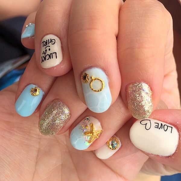 ホワイトラインで描いたシェルや、カラフルなスターフィッシュがふんわりした雰囲気に仕上げてくれます♪